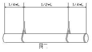 裝卸單管時(shí),要使用柔順的吊帶、吊繩或繩索起吊,帆布帶或尼龍繩,最小寬度為19cm,尼龍繩的最小直徑為30mm,若用鋼索或鐵鏈吊運(yùn)管子必須在上面套上橡膠管或其它柔性管,禁止拋落或碰擊管道。管子可用單點(diǎn)起吊(如圖2),也可用兩點(diǎn)起吊(如圖3),此法易控制管子的穩(wěn)定,切勿將繩子穿過(guò)管子內(nèi)部?jī)啥撕笃鸬?由于管道表面比較光滑,為安全起見(jiàn),通常提起兩個(gè)點(diǎn))。